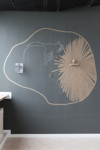 Papierklebeband, Kreide, Fotografie auf Chiffon, Objekt, ca 200 x 200, (Fotografien Annette Kradisch) 2019