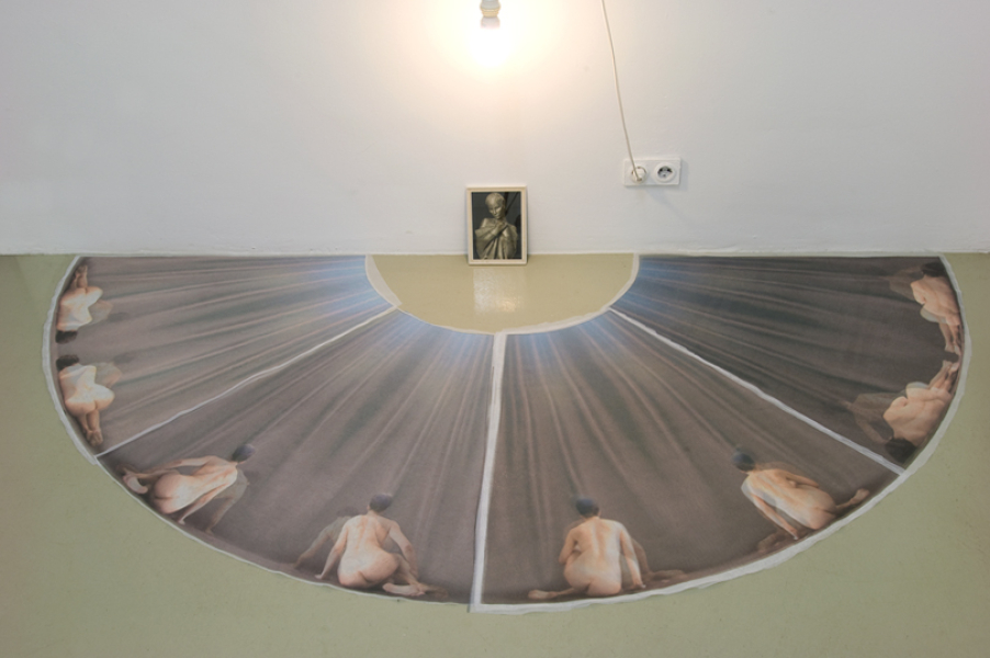 Rund um eine Fotografie liegen Probeausdrucke zu fiat lux aufgefächert — so entsteht eine ikonische Kultsituation. Die Fotografie zeigt eine Plastik von Georg Kolbe, in der er seine Frau verewigt hat. Die offenen Schneidekanten der Textilien betonen den spielerischen Workshop-Charakter der Arbeit, gleichzeitig wird dadurch das sorgfältig gefächerte Gewand der abgebildeten Frau zitiert. So kreist auch die zweite Arbeit der fan you Serie um Selbstbild und Ikonografie. (Fotografien Bruno Weiss) 2009