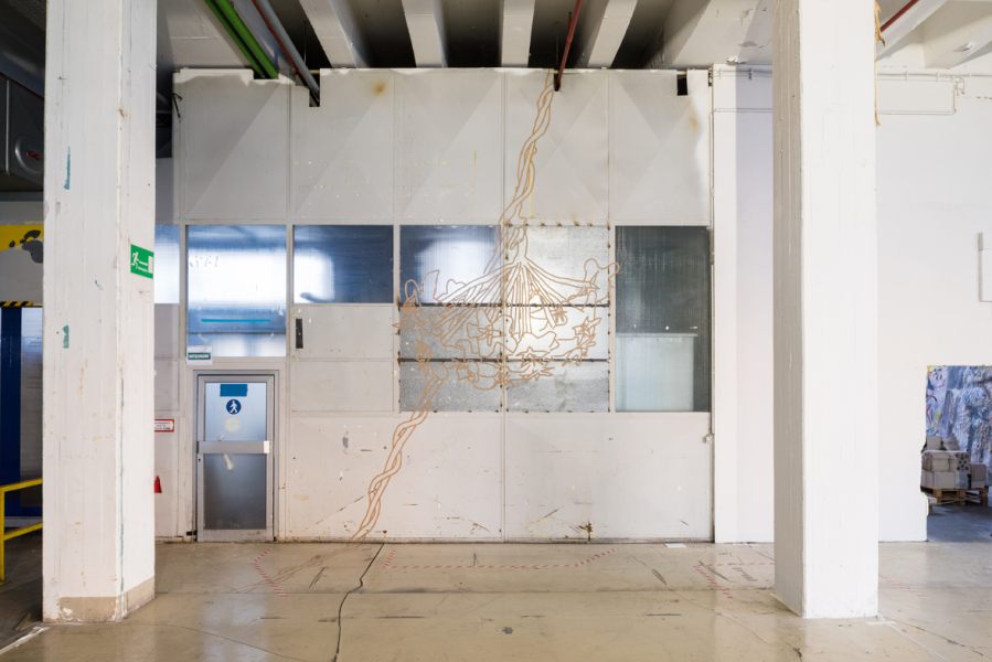 Auf AEG, Halle 15, Gemeinschaftsausstellung »OFFEN auf AEG«, Nürnberg, Klebebandzeichnung auf Metallwand, 600 x 300 cm, (Fotografien Annette Kradisch) 2018